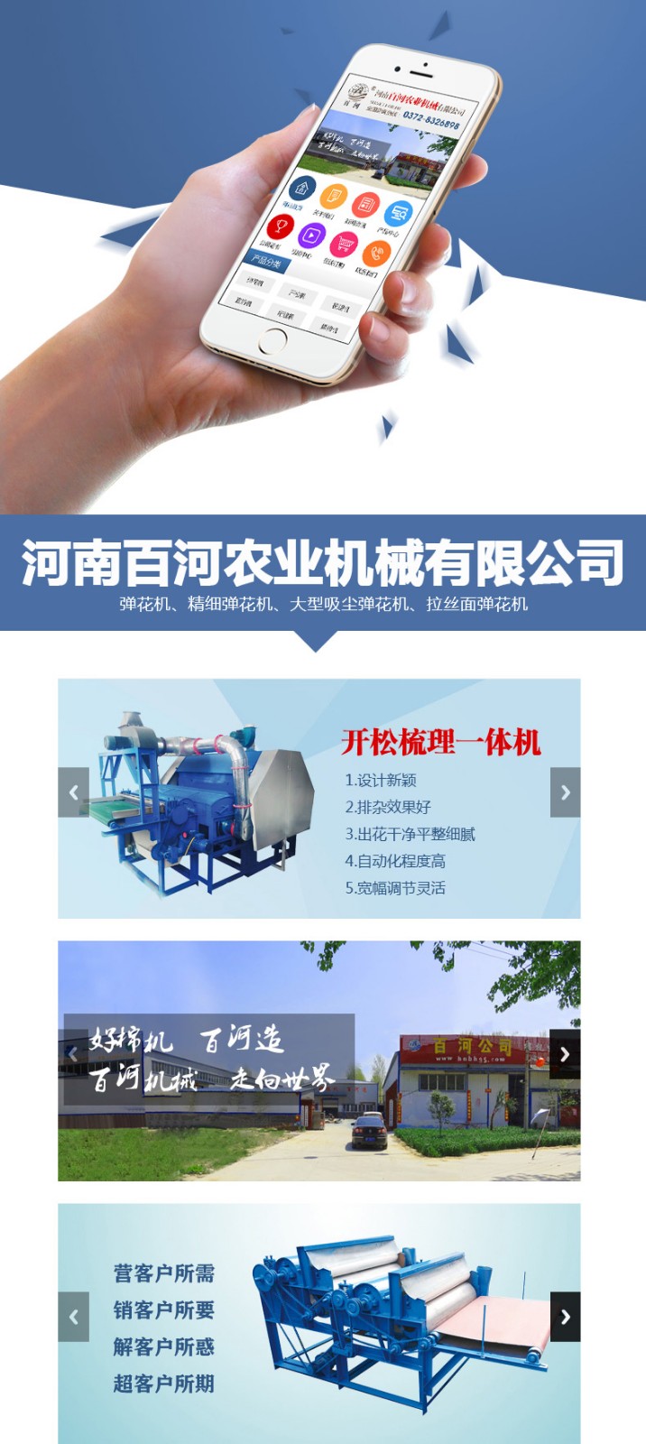 河南百河農(nóng)業(yè)機械有限公司主要生產(chǎn)彈花機、精細彈花機、大型吸塵彈花機、拉絲面彈花機、寬幅彈花機、梳理機、開松梳理一體機、精細梳理機、梳棉機、電腦絎縫機、絎縫機、全移動絎縫機、引被機、直絎機、軋花機、20片軋花機、鋸齒軋花機、揉棉機、無網(wǎng)被揉棉機、升降揉棉機、開松機、小型開松機、鋪網(wǎng)機、自動喂花機等家紡機械。